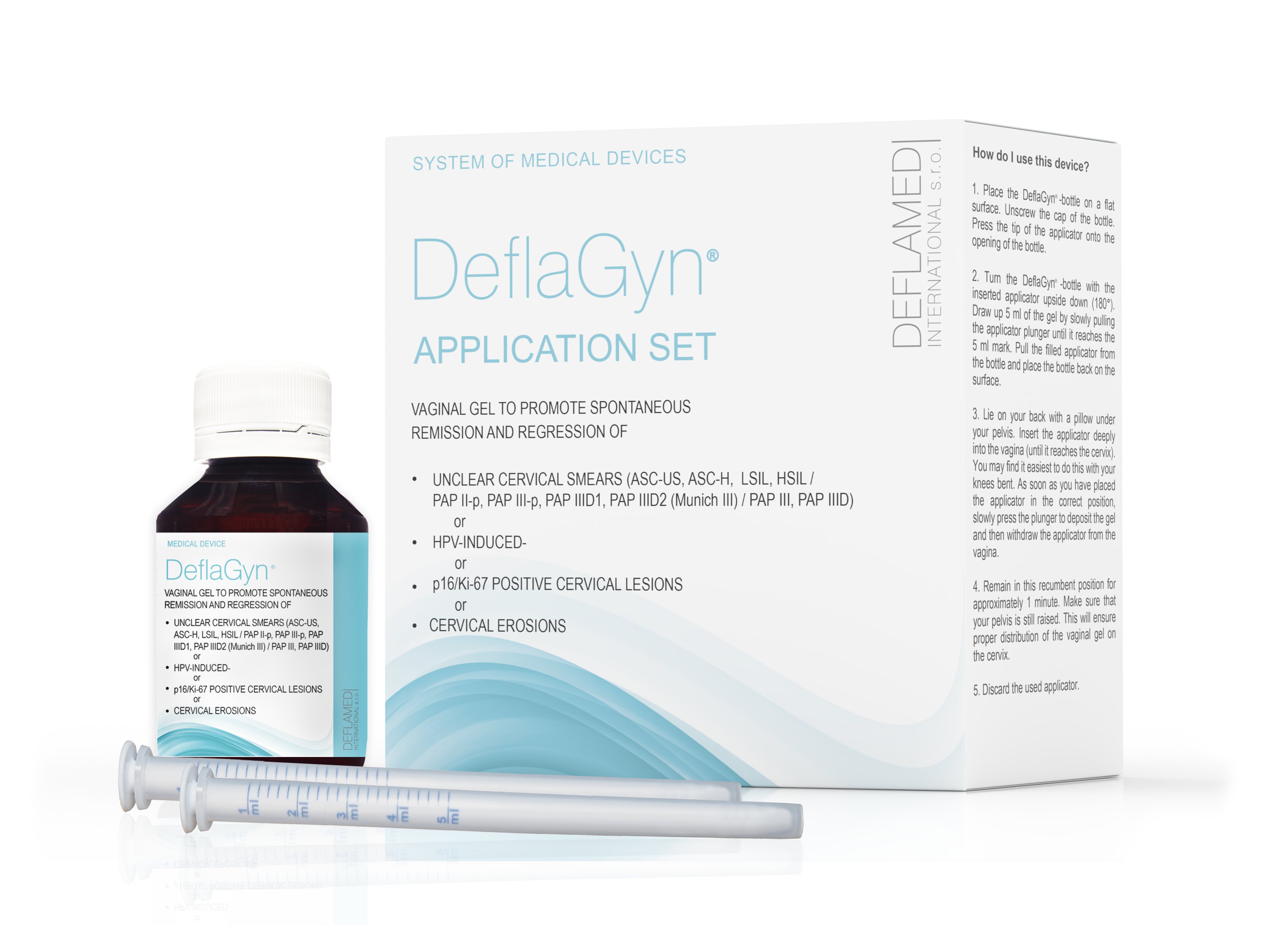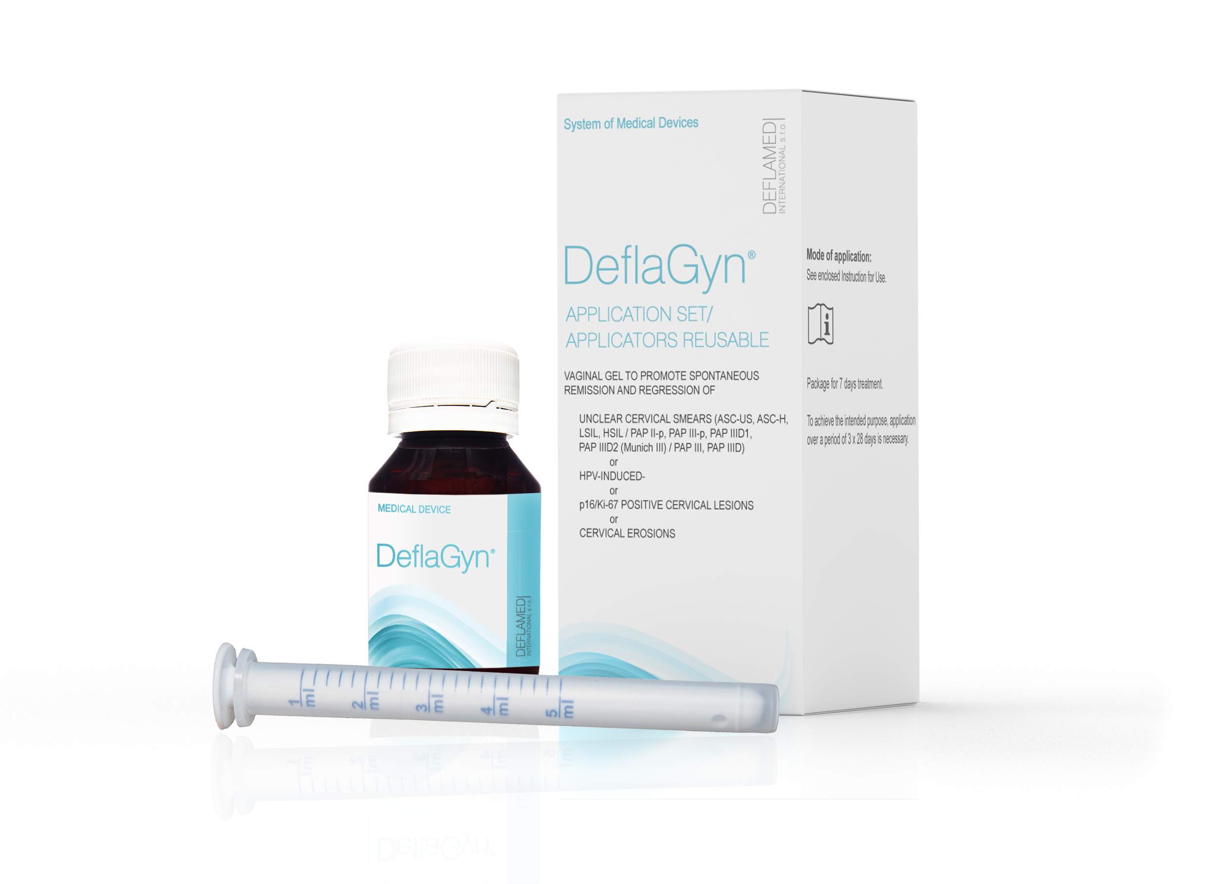 DeflaGyn® Vaginal Gel is intended to promote spontaneous remission and regression of Unclear Cervical Smears (ASC-US, LSIL, ASC-H, HSIL / PAP II-p, PAP III-p, PAP IIID1, PAP IIID2 (Munich III) / PAP III, PAP IIID) or HPV-induced or p16/Ki-67 positive Cervical Lesions or Cervical Erosions during waiting periods according to gynaecological guidelines because it is used primarily in the treatment-free observation periods.