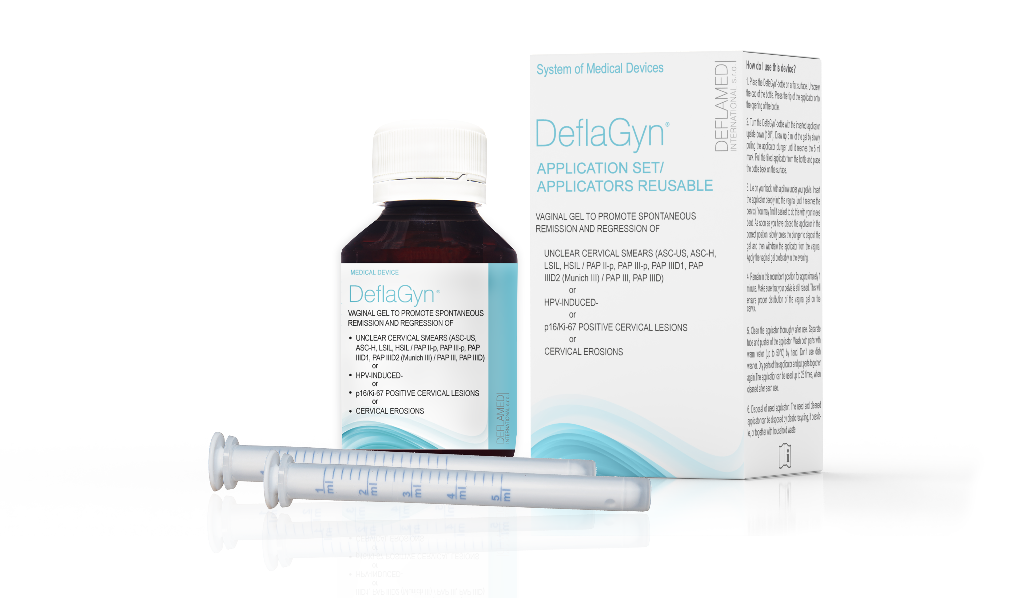 DeflaGyn® Vaginal Gel is intended to promote spontaneous remission and regression of Unclear Cervical Smears (ASC-US, LSIL, ASC-H, HSIL / PAP II-p, PAP III-p, PAP IIID1, PAP IIID2 (Munich III) / PAP III, PAP IIID) or HPV-induced or p16/Ki-67 positive Cervical Lesions or Cervical Erosions during waiting periods according to gynaecological guidelines because it is used primarily in the treatment-free observation periods.